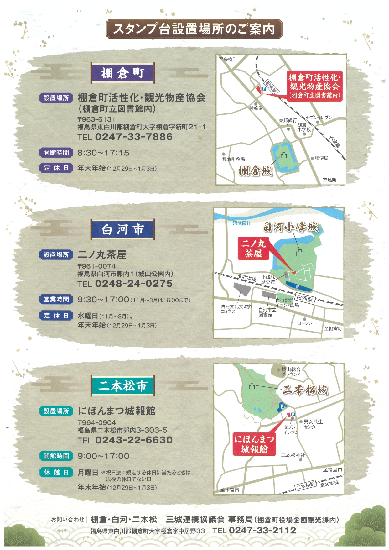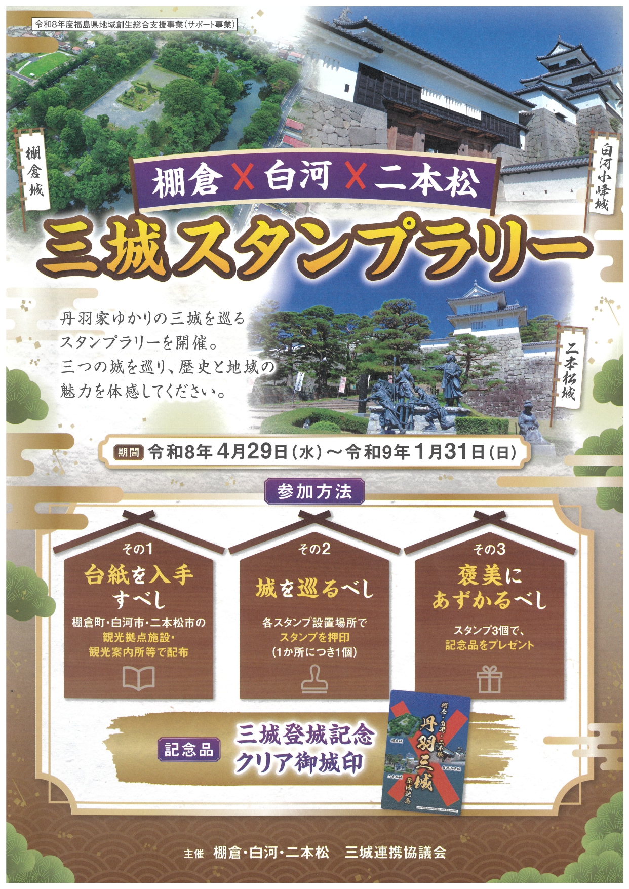 お知らせ 2026.04.28 【棚倉×白河×二本松】三城スタンプラリー(R8.4/29~R9.1/31) 丹羽家ゆかりの三城をめぐるスタンプラリーが明日4/29(祝・水)から始まります🤗 この機会に三つの城を巡り、記念品のクリア御城印をぜひゲットしてください🏯✨詳細は画像にて👀! 一覧へ戻る